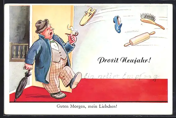 AK Mann kommt zu spät nach Hause, seine Frau wirft Gegenstände auf ihn, frauenfeindlicher Humor