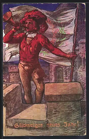 AK Mann mit Flagge bläst in ein Horn, Neujahr