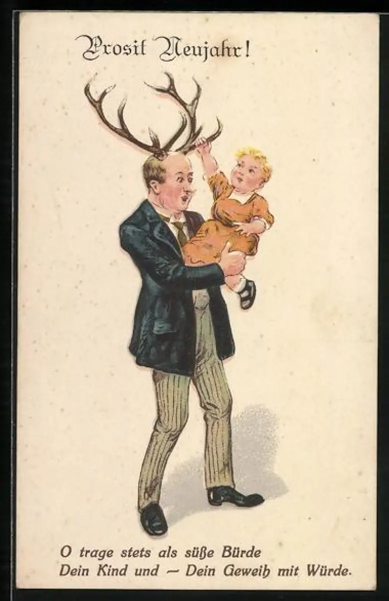AK Mann mit Geweih und Kind auf dem Arm, frauenfeindlicher Humor