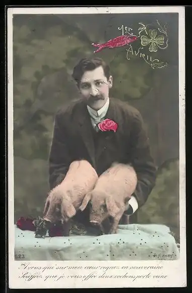 AK Mann mit Rosen und zwei Ferkeln, 1er Avril