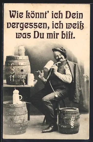 AK Mann mit mehreren Bierfässern und Krügen, Trinkspruch