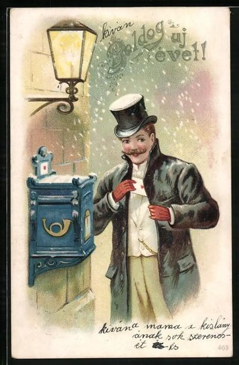 AK Mann steckt einen Brief in einen verschneiten Briefkasten, Boldog uj évet!