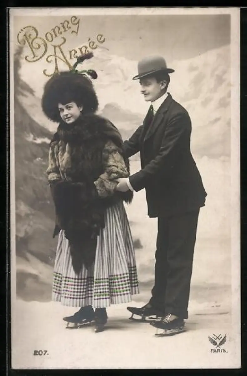AK Mann und Frau in Winterkleidung auf Schlittschuhen