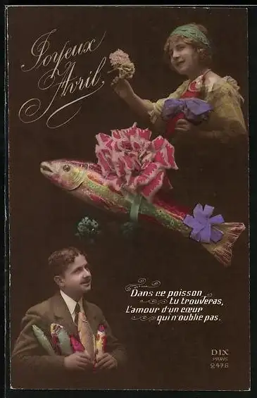 AK Mann und Frau mit dekorierten Fischen, Joyeux Avril