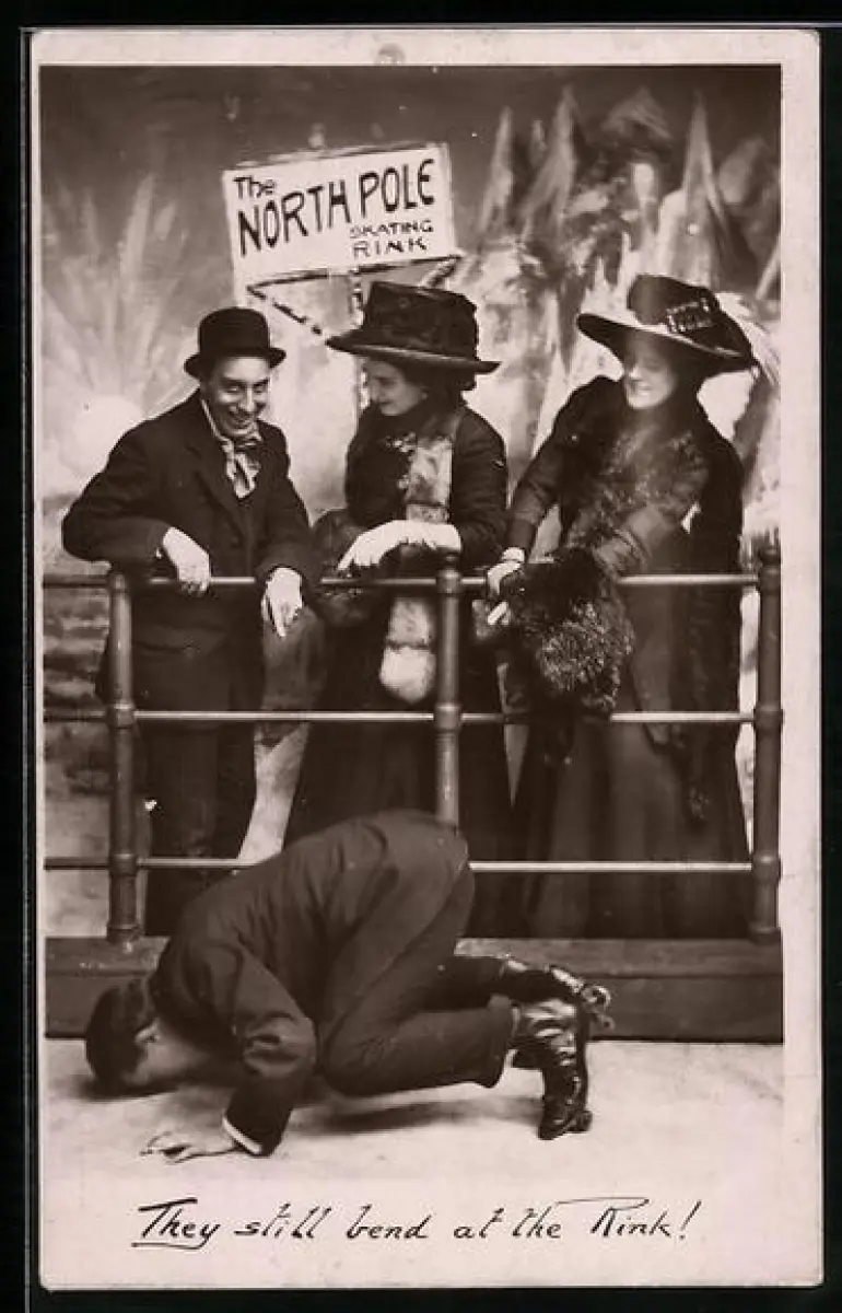 AK Mann und zwei Frauen lachen über einen Mann, der auf Rollschuhen hingefallen ist, North Pole Skating Rink