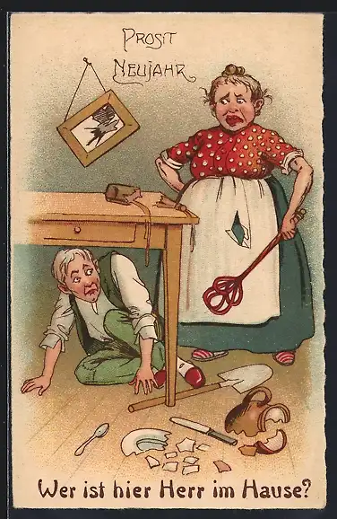 AK Mann versteckt sich vor Frau unterm Tisch, Neujahrsgruss, frauenfeindlicher Humor