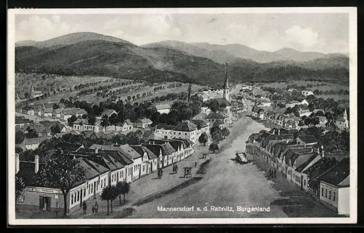 AK Mannersdorf a. d. Rabnitz, Hauptstrasse mit Brunnen und Kirche