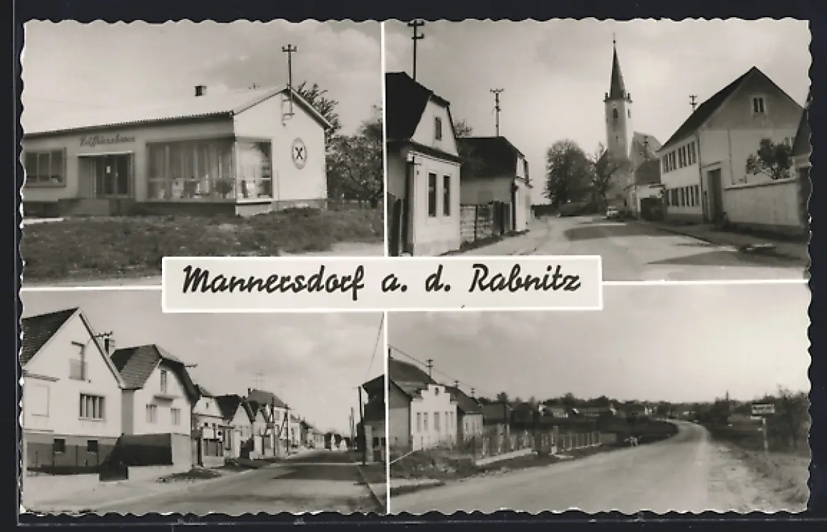 AK Mannersdorf a. d. Rabnitz, Raiffeisenkasse, Strassenpartie mit Kirche