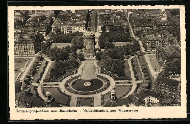 AK Mannheim, Friedrichsplatz mit Wasserturm vom Flugzeug aus
