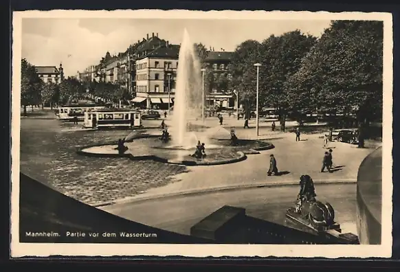 AK Mannheim, Partie vor dem Wasserturm mit Strassenbahn