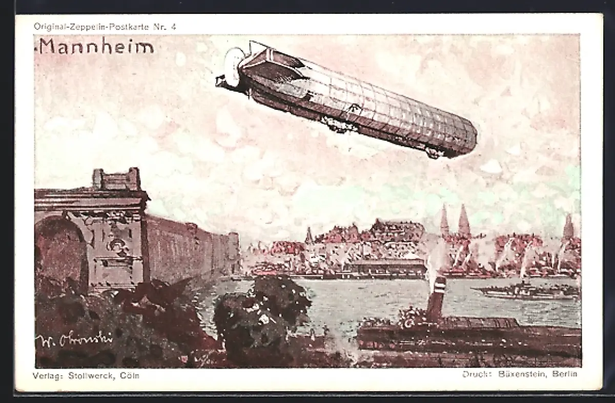 AK Mannheim, Zeppelin über der Stadtmit Dampfer, Kakao