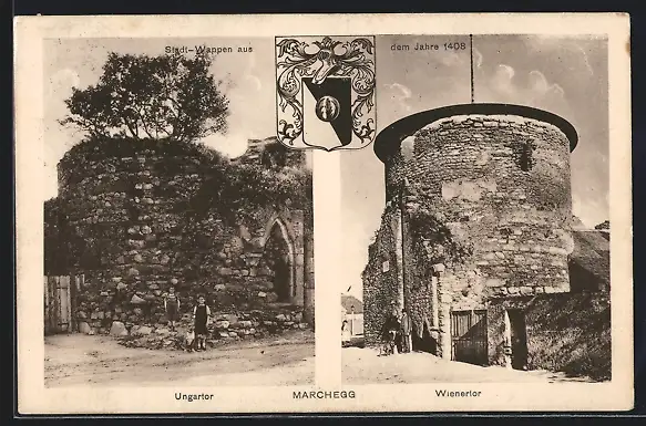 AK Marchegg, Ungartor, Wienertor, Stadt-Wappen