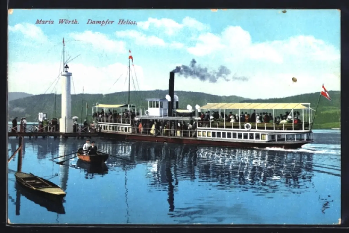 AK Maria Wörth, Dampfer Helios, Anlegesteg, Ruderboote