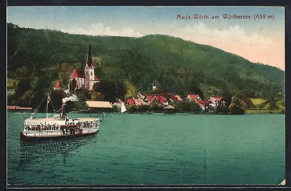 AK Maria Wörth am Wörthersee, Uferpartie mit Kirche und Dampfer