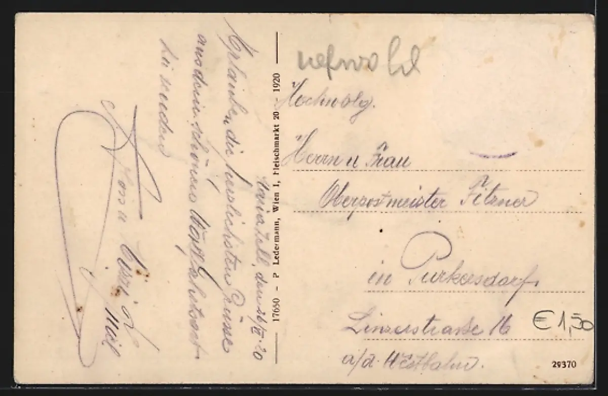 alte Ansichtskarte, gelaufen 1920, Briefmarke entfernt, rückseitig Oberflächenschaden, guter Zustand