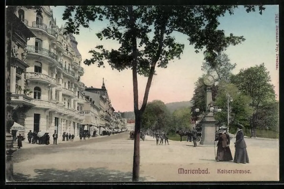 AK Marienbad, Partie in der Kaiserstrasse mit Uhrsäule