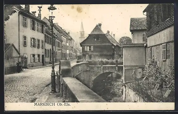 AK Markirch /Ob.-Els., Strassenpartie mit Brücke und Kirche