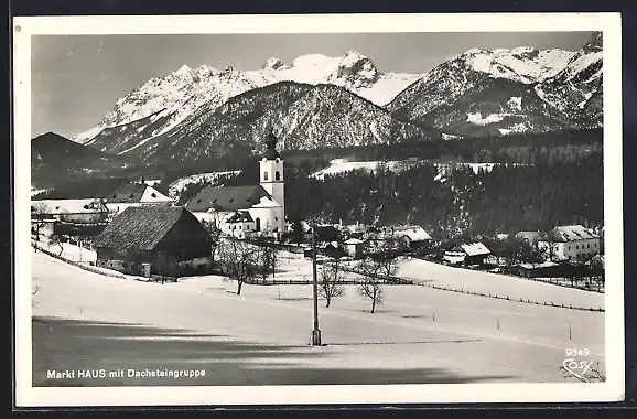 AK Markt Haus, Ortspartie mit Kirche und Dachsteingruppe im Schnee