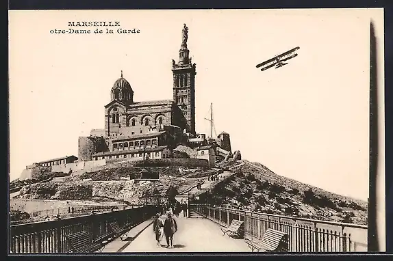 AK Marseille, Doppeldecker-Flugzeug bei der Notre-Dame de la Garde
