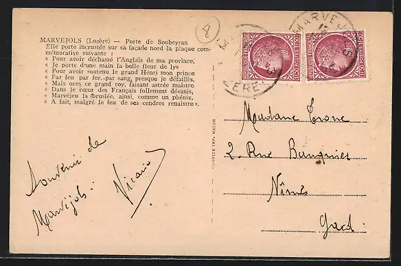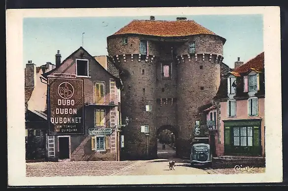 AK Marvejols, Porte de Soubeyran avec publicité Dubonnet et voiture ancienne
