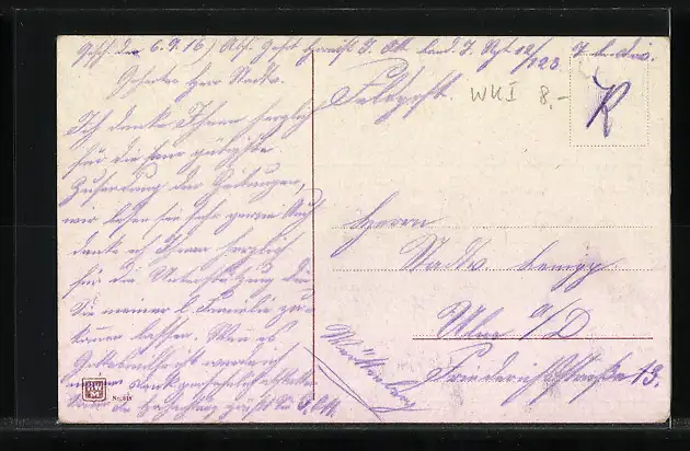 Personenbezogene Daten auf der Rückseite der Karte wurden durch blauen Textmarker unkenntlich gemacht. Die blauen Stellen sind auf die Vorderseite durchgeweicht und wirken sich negativ auf das Postkartenfoto aus