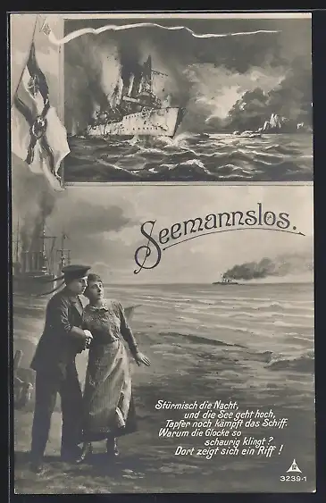 AK Matrose mit seiner Freundin, Kriegsschiff aus See, Reichskriegsfahne, Spruch Seemannslos
