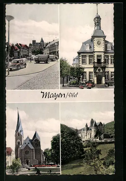 AK Mayen /Eifel, Strassenpartie mit Autos, Rathaus, Kirche