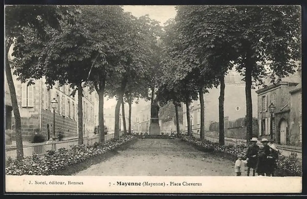AK Mayenne, Place Cheverus avec allée arborée et passants