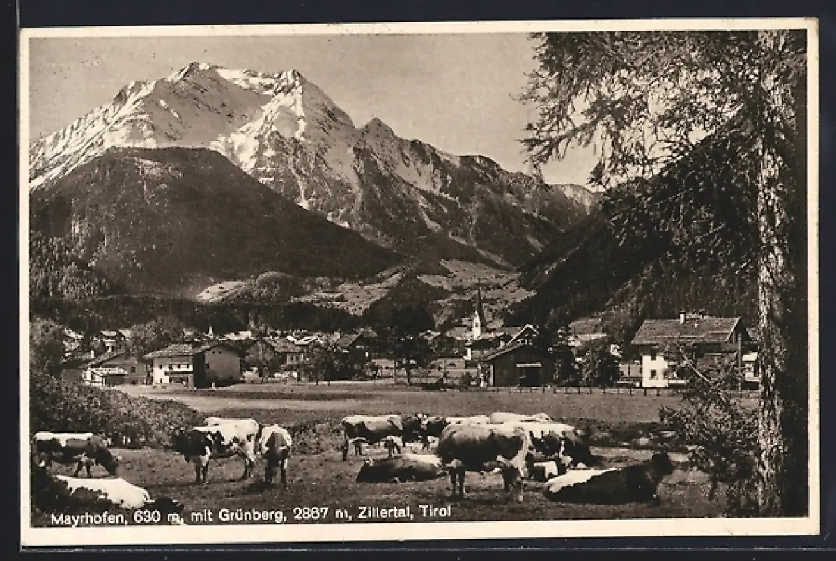 AK Mayrhofen, Ortsansicht mit Grünberg und Zillertal, Kühe