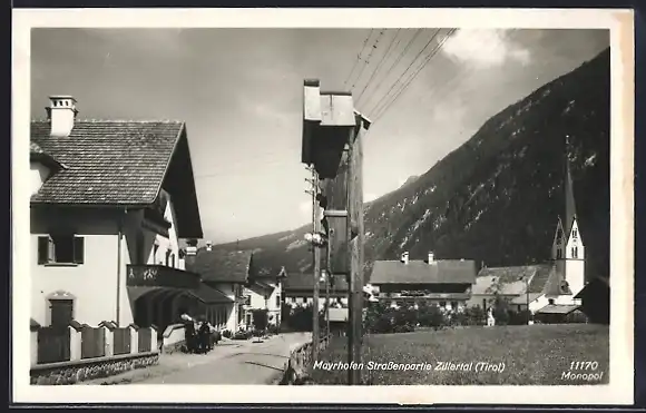 AK Mayrhofen /Zillertal, Strassenpartie mit Flurkreuz