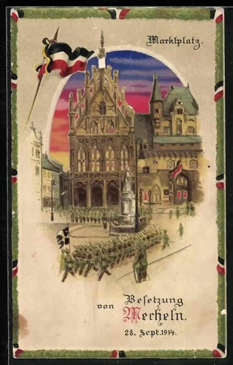 AK Mecheln, Besetzung von Mecheln 1914, Truppen marschieren auf den Marktplatz, Halt gegen das Licht