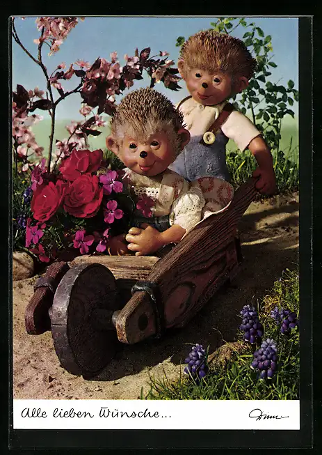 AK Mecki fährt mit der Schubkarre im Karten, Alle lieben Wünsche...