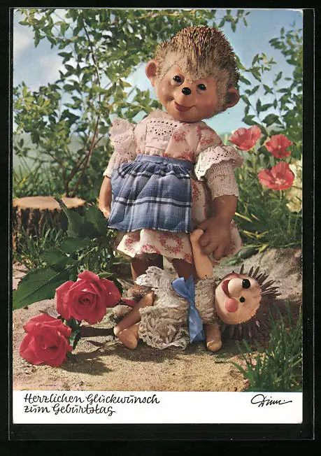 AK Meckis Tochter steht lächelnd im Garten, Herzlichen Glückwunsch zum Geburtstag!