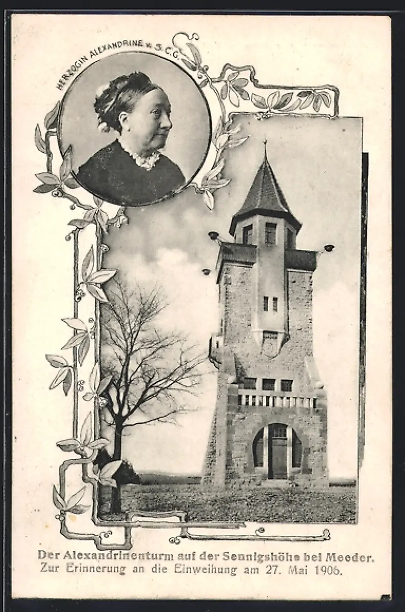 AK Meeder, Alexandrinenturm auf der Sennigshöhe, Einweihung 1906, Portrait Herzogin Alexandrine