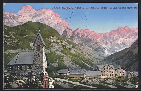 AK Meglisalp, Ortsansicht mit Kirche, Altmann u. Säntis
