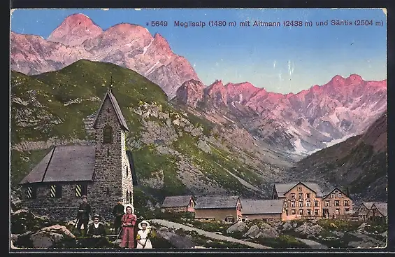 AK Meglisalp, Ortsansicht mit Kirche, Altmann u. Säntis