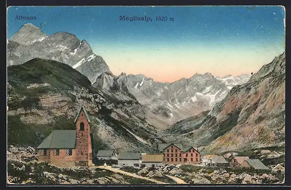 AK Meglisalp, Ortsansicht umgeben von Bergen
