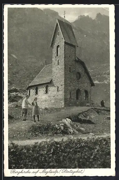AK Meglisalp /Säntisgebiet, Wanderer vor der Bergkirche
