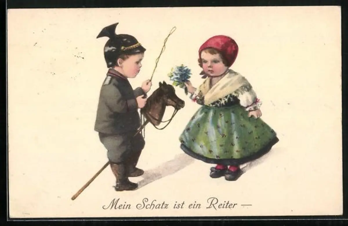 AK Mein Schatz ist ein Reiter, Kleiner Soldat mit Steckenpferd und Mädchen