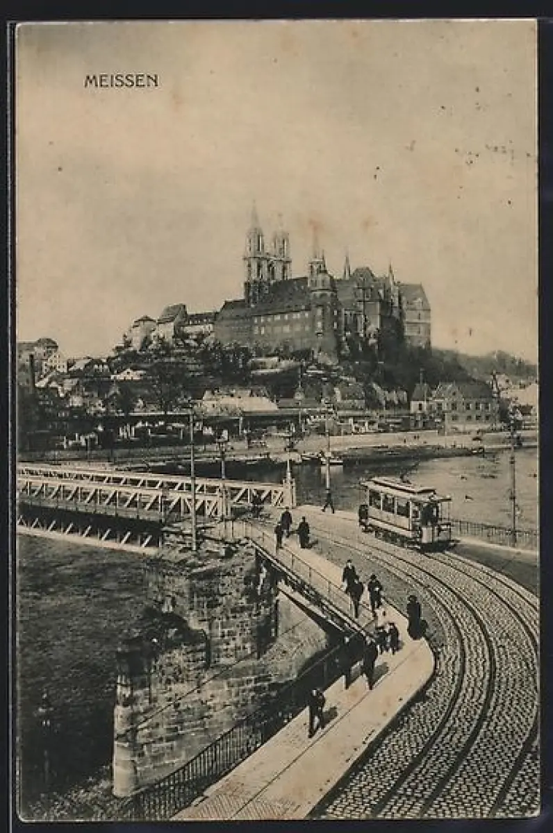 AK Meissen, Blick zur Albrechtsburg, Strassenbahn auf Elbebrücke