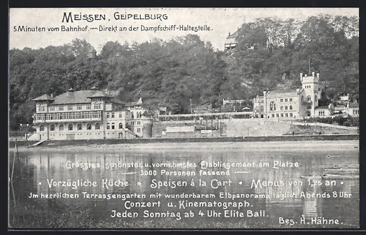 AK Meissen, Gasthaus Geipelburg H. Hähne, Elbpanorama, Terrassengarten