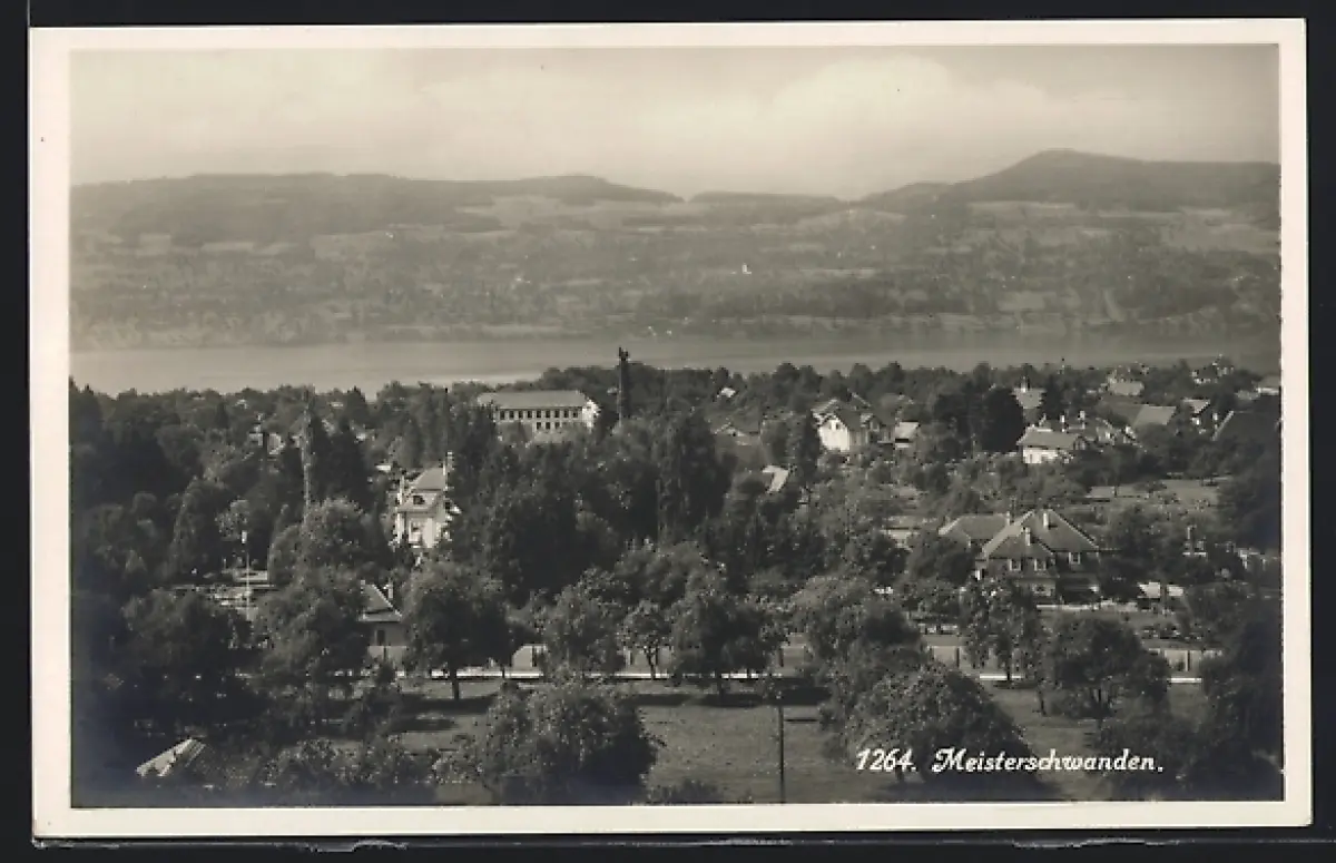 AK Meisterschwanden, Totalansicht mit Anlage, See und Fernblick aus der Vogelschau