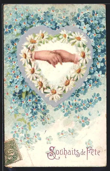 AK Menschen reichen sich die Hände in einem Herz aus Margeriten mit Vergissmeinnicht