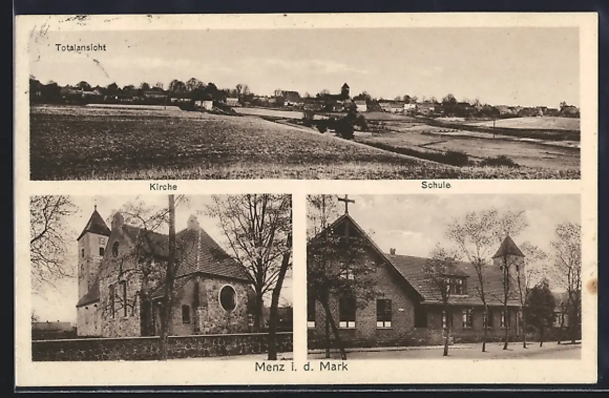 AK Menz i. d. Mark, Kirche, Schule, Blick auf den Ort