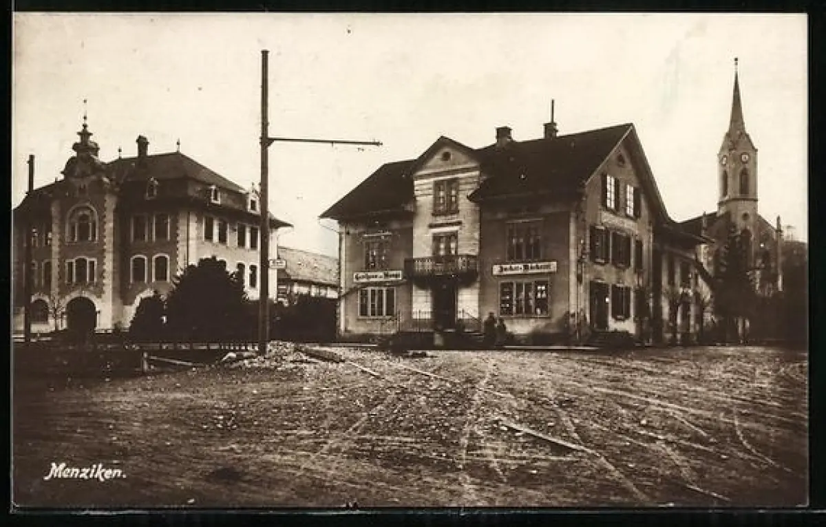 AK Menziken, Gasthaus zur Waage und Zucker-Bäckerei mit Kirche