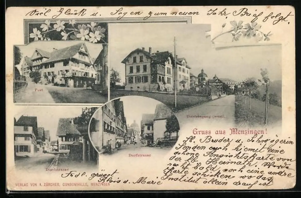 AK Menzingen, Dorfeingang westl., Post, Strassenpartien