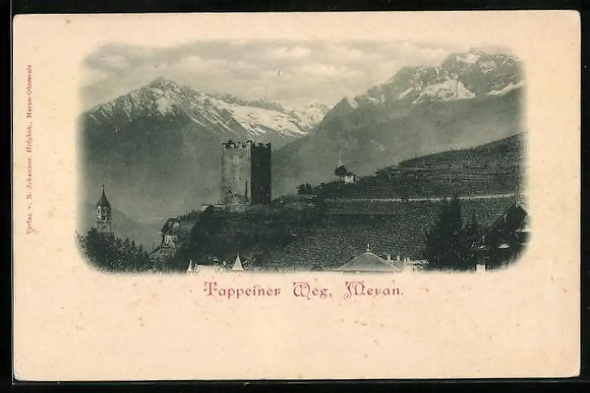 AK Meran, Tappeiner Weg mit Blick auf das Hochgebirge