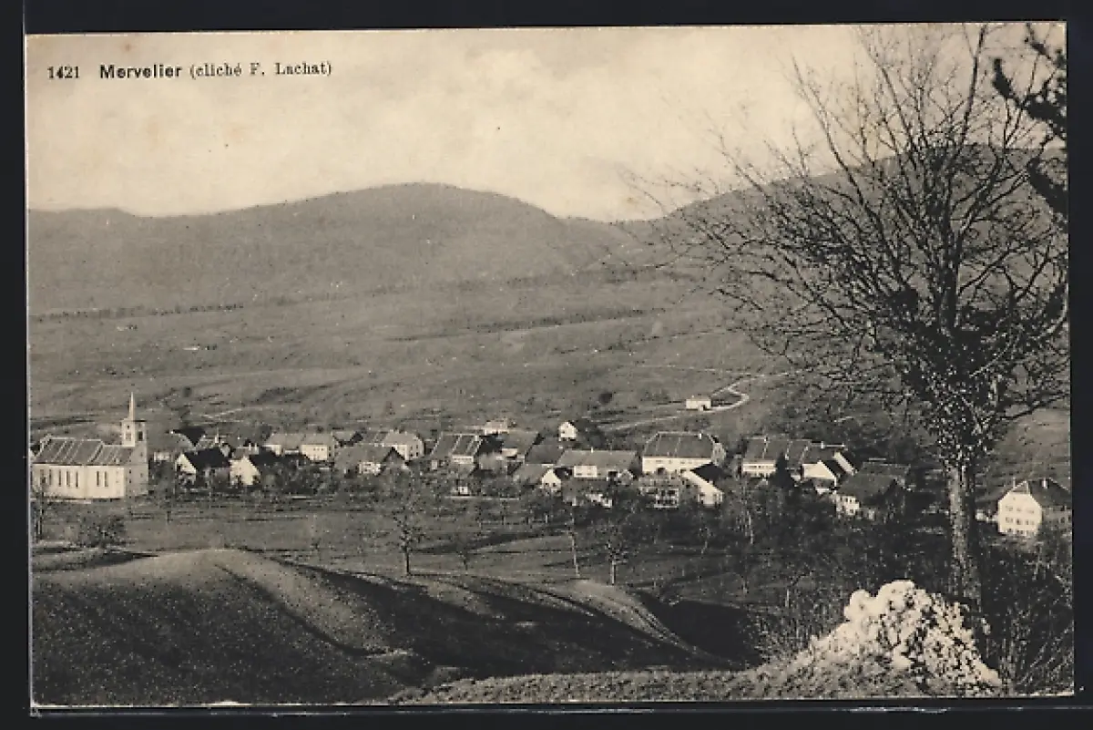 AK Mervelier, Totalansicht mit Bergpanorama aus der Vogelschau