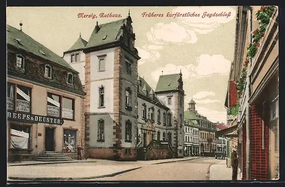 AK Merzig, Strassenpartie mit Rathaus und Geschäften
