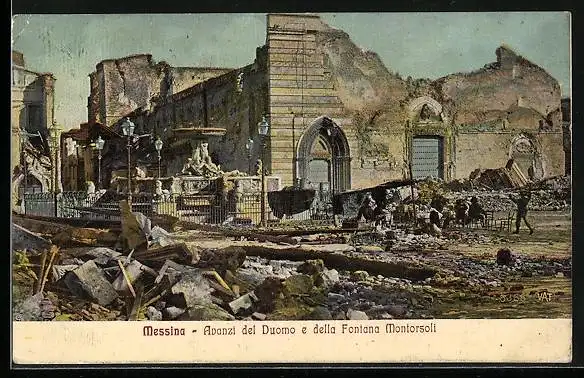AK Messina, Avanzi del Duomo e della Fontana Montorsoli, Häuserruinen nach dem Erdbeben